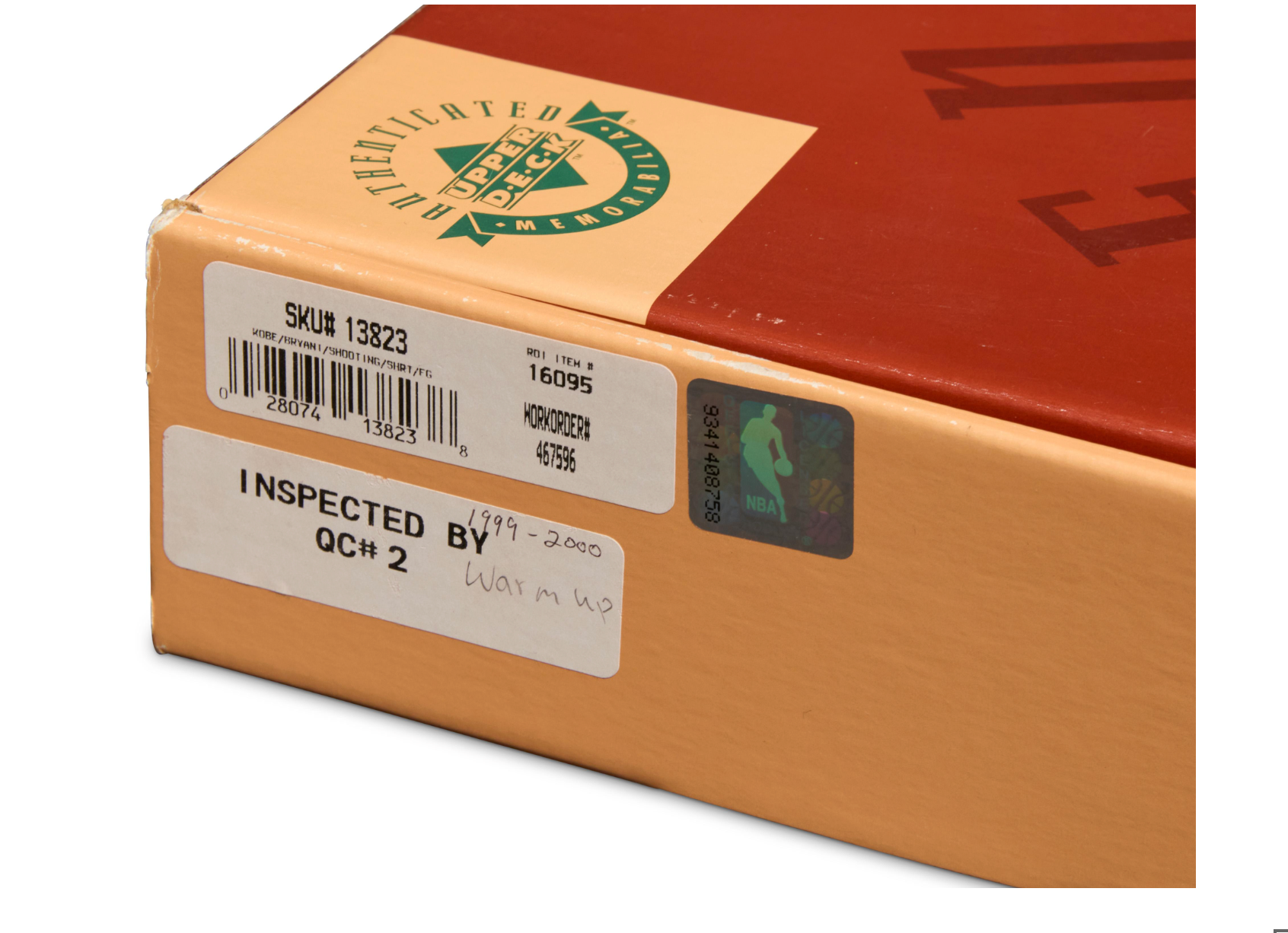 Authentic 1999-2000 Lakers warm-up piece featuring Kobe Bryant's signature and number embroidered in black across the chest. This yellow Nike zip-neck shooting shirt exemplifies the iconic gear worn during the early championship era. Includes original Upper Deck box and Certificate of Authenticity (no. BAG 04927) with matching holographic verification tags, ensuring provenance and collectibility. Size L. A museum-quality addition for serious Lakers and Kobe memorabilia collectors.