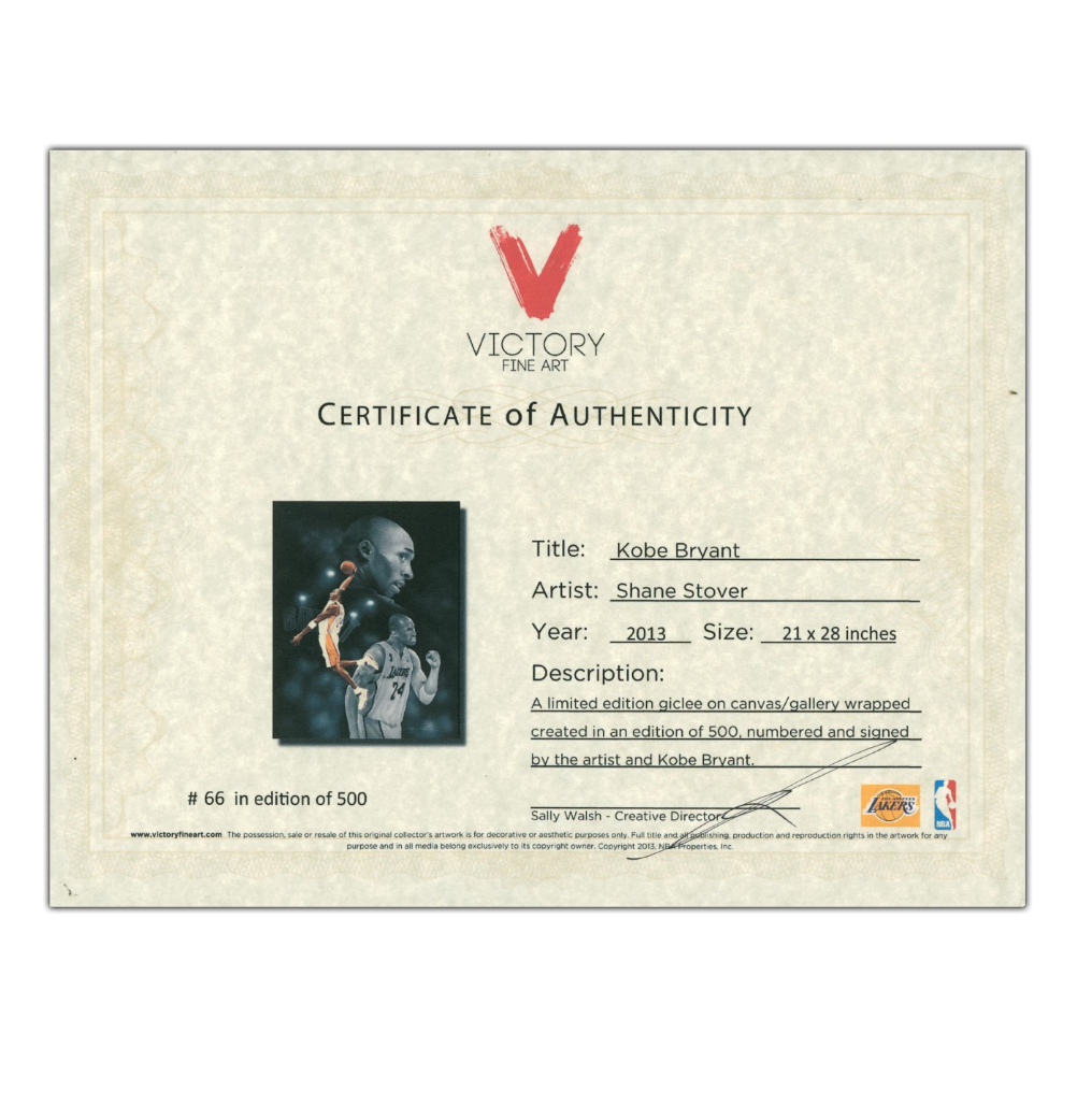 Kobe Bryant Autographed Shane Stover LE Canvas 21 x 28 VICTORY COA Own a museum-quality piece of basketball history. This limited edition canvas features Kobe Bryant rendered by renowned sports artist Shane Stover, hand-signed by the legend himself in silver ink. The artwork measures 21" x 28" and exhibits exceptional condition, grading 9-10. Includes authentic Victory Certificate of Authenticity. A rare collectible for serious enthusiasts and investors seeking verified, high-grade memorabilia with documented provenance.