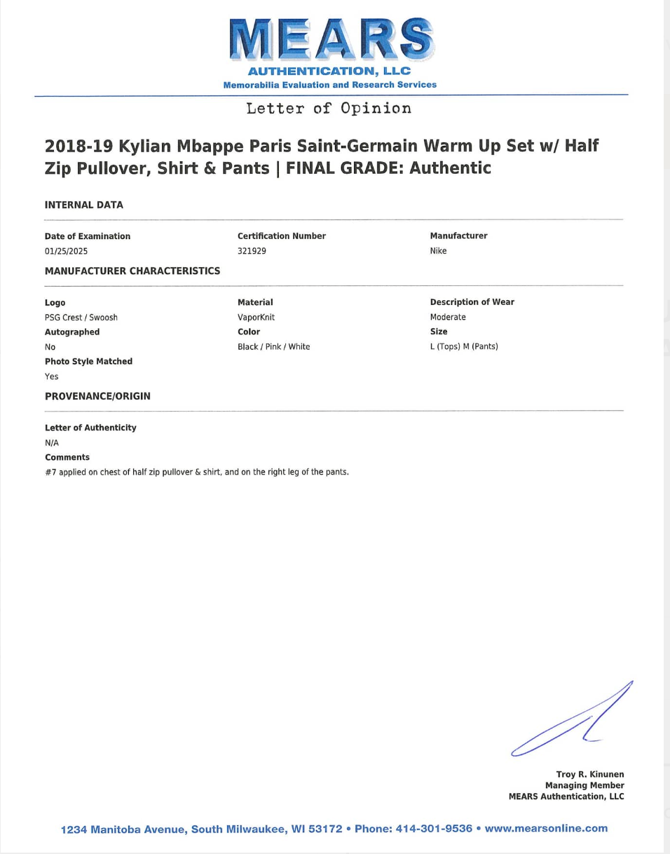 Condition presents as you would expect for a true warm up set, with normal light wear and handling consistent with player issued equipment, and the colors and graphics show well for display. A complete three piece Mbappe PSG warm up group with MEARS LOA is a strong way to represent his early PSG period with something more substantial than a single standalone shirt.