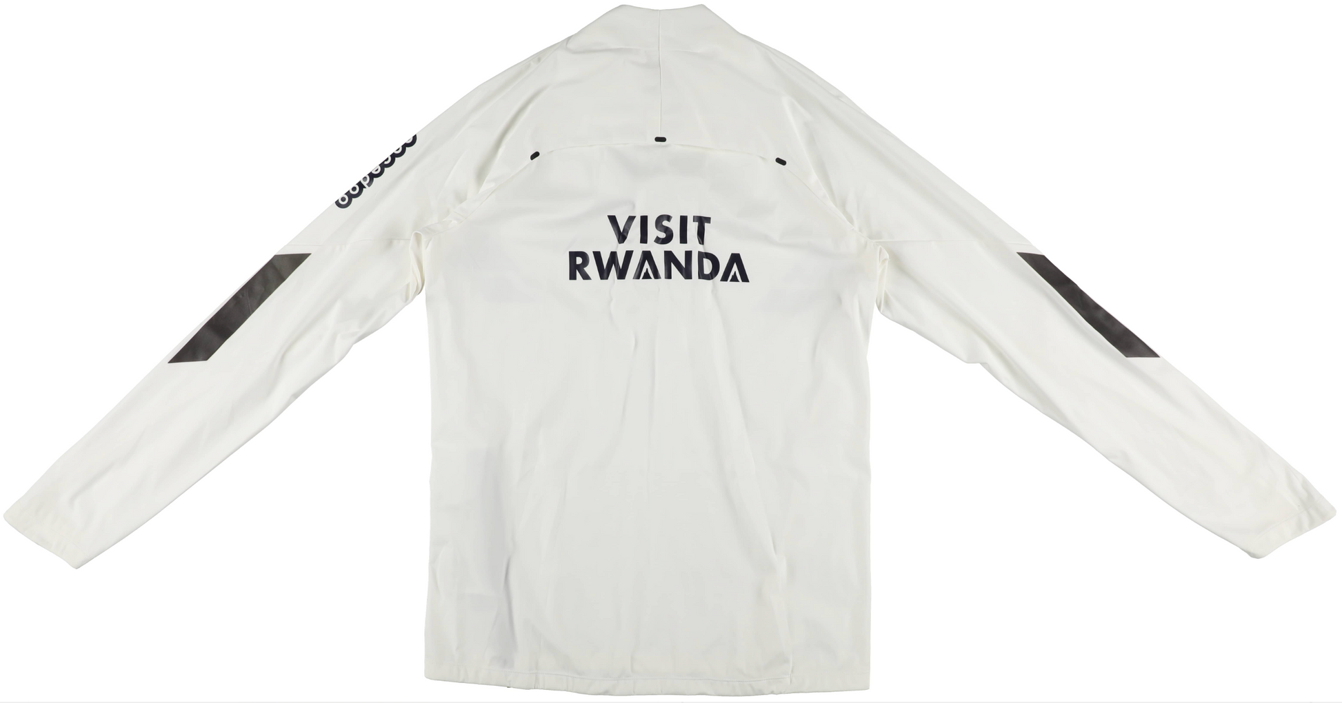 Offered is a 2021 22 Paris Saint Germain half zip pullover windbreaker shirt from the Messi PSG era, being listed as game used/game issued. This is the white long sleeve half zip style with the PSG crest on the chest, the Jordan brand mark opposite, and the ALL Accor Live Limitless sponsor across the front. The back features the Visit Rwanda mark, which is a detail that immediately reads as PSG training and travel gear from this period.