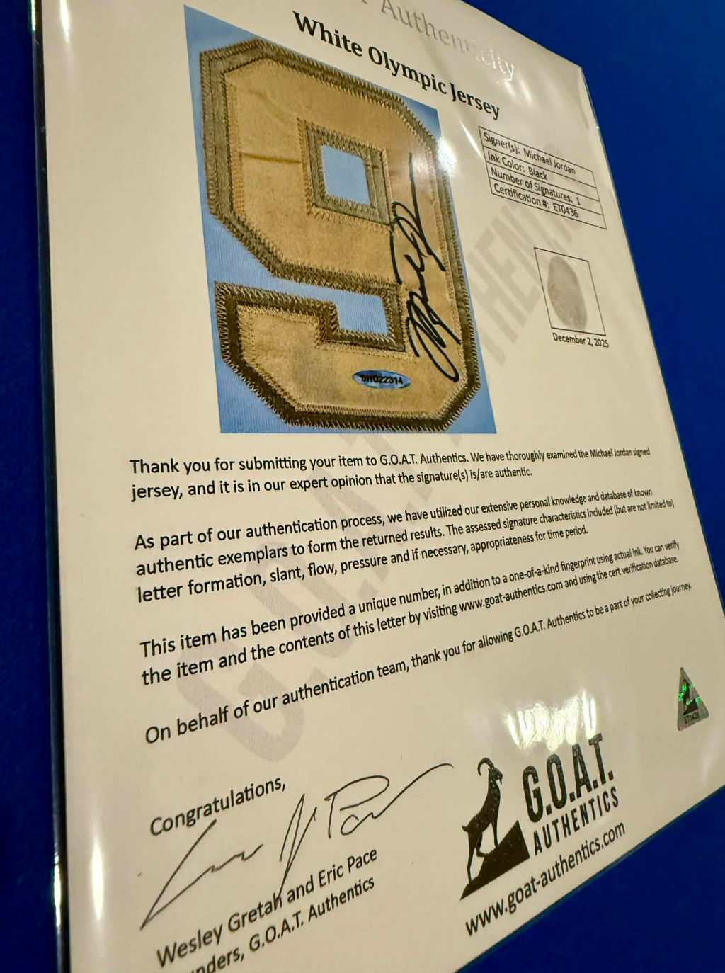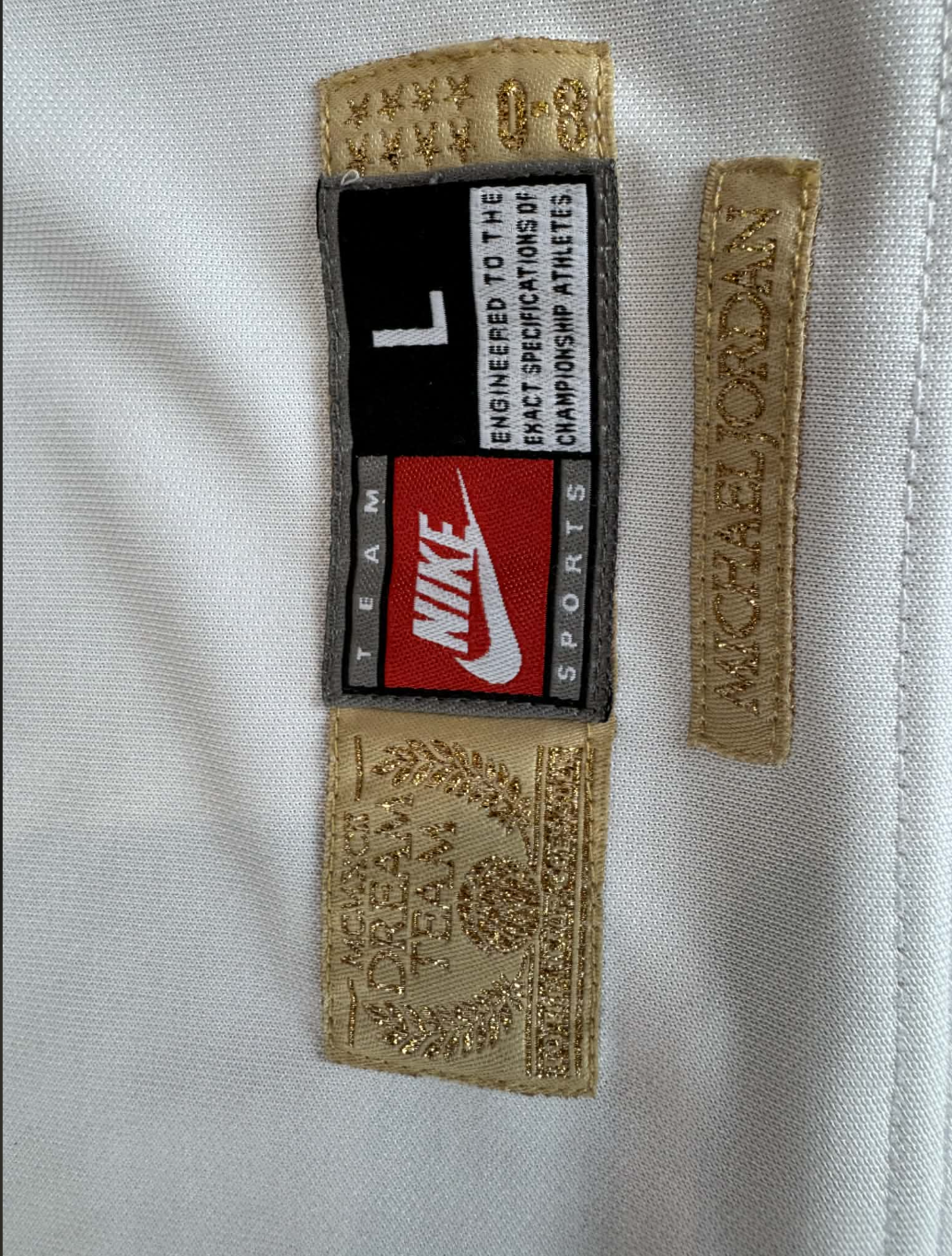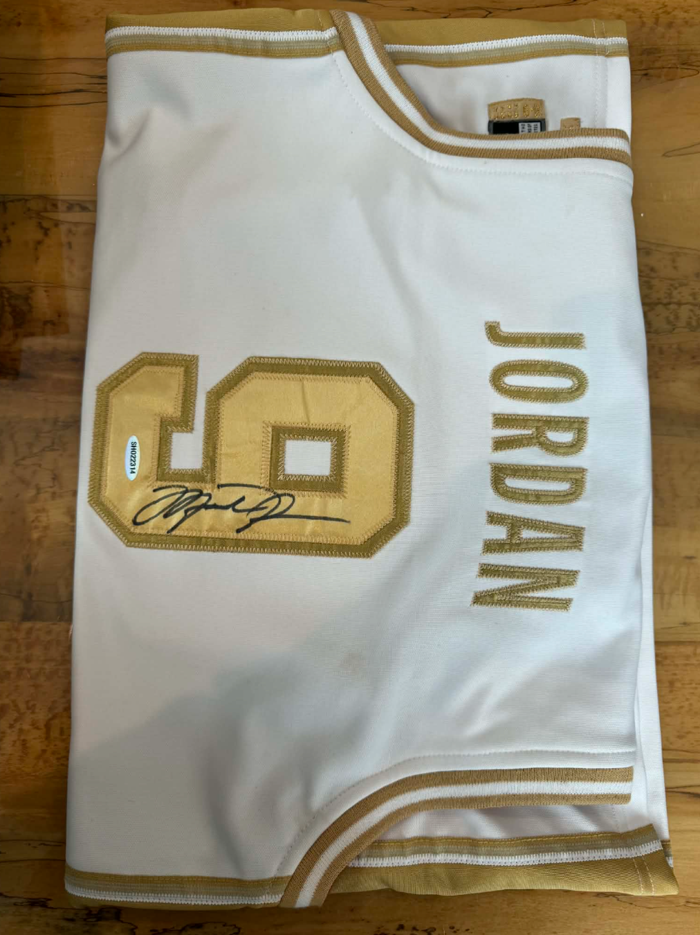 Authentic Michael Jordan #9 Dream Team jersey featuring a bold, full-length signature authenticated by UDA and GOAT. This rare collectible showcases premium white and gold styling with exceptional craftsmanship and weight. Includes Upper Deck hologram certification for guaranteed authenticity. A museum-quality piece for serious Jordan and basketball memorabilia collectors seeking investment-grade provenance and iconic Dream Team history.