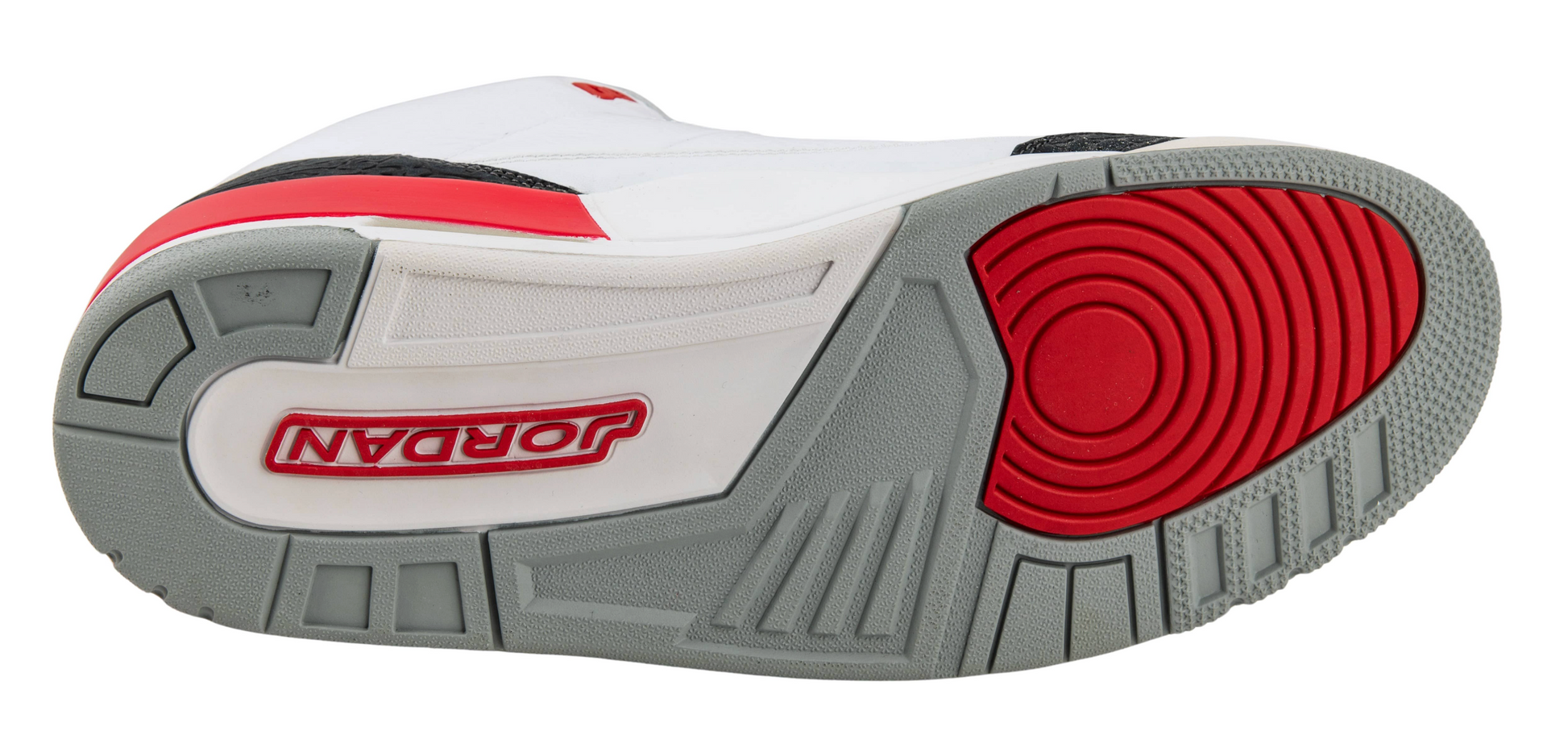 Offered is a single signed Air Jordan 3 Retro in the White and Red colorway, size 13. This is the classic AJ3 silhouette with the white leather upper, grey elephant print at the toe and heel, and red accents including the Jumpman on the tongue, giving it the unmistakable look collectors chase on this model.